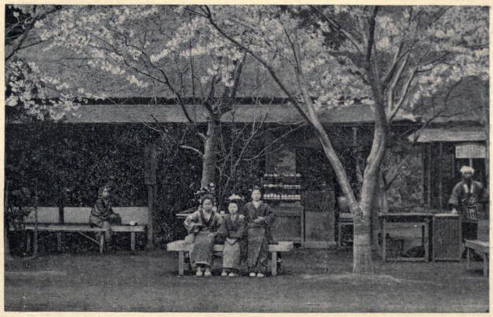 Later in the season the carefully tended trees in the palace grounds put forth their blossoms, and sovereign and courtiers hang poems on their branches, while the spring garden party gathers the whole court circle under the aisles of bloom in the palace grounds of Hama Rikiu. Every citizen who has a garden gives an out-door fête, and flower-bordered cards invite guests to see the native sakura, or the cerisiersof the diplomatic set.
