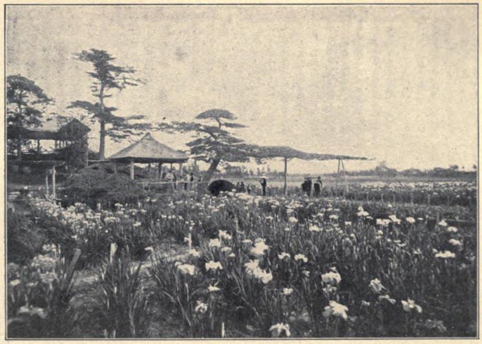 For a week in June, jinrikishas spin up this leafy tunnel to the iris fêtes at Hori Kiri, where in ponds and trenches grow acres of such fleur-de-lis as no Bourbon ever knew. Compared with the cherryblossom carnival, this festival is a quiet and decorous garden party, where summer-houses, hills, lakes, armies of royal flowers, and groups of visitors seem to be consciously arranging themselves for decorative effects.