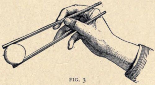 Before each guest were set the tabako bon, a tray holding a tiny hibachi with live coals lying in a cone of ashes, and a section of bamboo stem for an ash-receiver. Then came the tea and sweetmeats, inevitable prelude to all good cheer. Next the nesans set in front of each guest an ozen, or table, not four inches in height, on which stood a covered lacquered bowl containing the first course, a tiny cup of soy, or piquant bean sauce, in which to dip morsels of food, and a long envelope containing a pair of white pine chopsticks. The master of the feast broke apart his chopsticks, which were whittled in one piece and split apart for only half their length, to show that they were unused, and began a nimble play with them. In his fingers they were enchanted wands, and did his bidding promptly; in ours they wobbled, made x’s in the air, and deposited morsels in our laps and upon the mats alternately. The nesans giggled, and the host almost forgot his Japanese decorum, but the company patiently taught us how to brace one chopstick firmly in the angle of the thumb and against the third finger. That stick is immovable, and the other, held like a pen with the thumb and first and second fingers, plays upon it, holding and letting go with a sureness and lightness hardly attained with any other implements. The supreme test of one’s skill is to lift and hold an egg, the round surface making a perfect balance and firm hold necessary, while too much force applied would cause disasters.