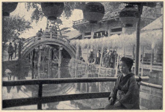 the last week of June, is often postponed to the more settled season of July. Flat-bottomed house-boats, with open sides, awnings hung round with lanterns, and sturdy boatmen at either end of the craft, go up the river by hundreds and thousands at sunset, gliding out from the creeks and canals that everywhere intersect the city. The glittering fleet gathers in the broad stretch of stream lying between the Asakusa bashi and the Ryogoku bashi, and these two bridges are black with spectators. The rows of tea-houses lining both shores spread red blankets over the balcony railings, and hang row upon row of lanterns along balustrades and eaves. With their rooms thrown wide open to the water, they themselves look like great lanterns. Every room of every house has its dinner party, the teahouse of the Thousand Mats being engaged months before hand, and every maiko and geisha bespoken. Boats command double prices, and nearly every boat has its family group; little children in holiday dress, their elders in fresh silk, crape, gauze, or cotton kimonos, sitting on the red floor-cloth, each with a tray of dolls’ dishes, filled with the morsels of dainty things that make up a Japanese feast, and saké bottles circulating freely. The lines of lanterns shed a rose-colored light over all; and at one end a pretty maiko goes through her graceful poses, the company keeping time with her in rhythmical hand-clappings. Peddlers of fruit, candies, fireworks, and saké; performing jugglers, acrobats, and story-tellers; floating restaurants, theatres, side-shows, and boat-loads of musicians row in and out among the rest. Talk, laughter, and the wailing notes of samisens fill the air with a hum that swells to cheers and roars as the swift rockets fill the air with balls, fountains, sheaves, sprays, jets, and trails of light; or fiery dragons, wriggling monsters, rainbows, and water-falls shine out on the dark night sky. Although saké flows everywhere, there is no drunkenness or disorder to degrade these gentle, cheerful merrymakers.