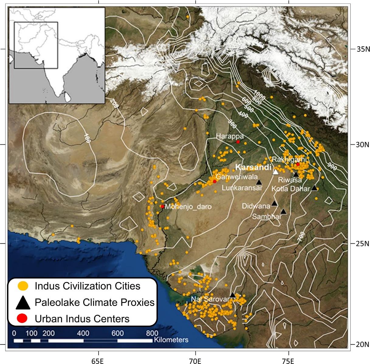 characterizedbydistinctivearchitecturalelementsandmaterialculture(Kenoyer,1998; Clark,2013).ElaborateexamplesoftheIndusCivilization’sorganizationareexemplified bytwoofitslargestcities,HarappaandMohenjo-daro,whicharelocatedadjacenttomajor Himalayanriversandmonsoon-fedseasonalrivers.Someofthecharacteristicsofthesesocietiesincludeeffectivewastewaterdrainageandpossiblyevenpublicbathsandstorehouses forgrain.ArcheologistsandanthropologistsrevealedthattheHarappanCivilizationwasa well-settledcivilizationandthatagriculturewasthebackboneofthatsociety(Fig.1).TheevidencehasfurtherrevealedthattheIndusRiverwasthemainreasonforthiscivilization’s agriculturaldevelopment,economy,andoverallprosperity.