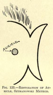 Szymanowski advises making an ear from the skin immediately back of the auditory canal if present, making the incisions of the shape shown in Fig. 123.