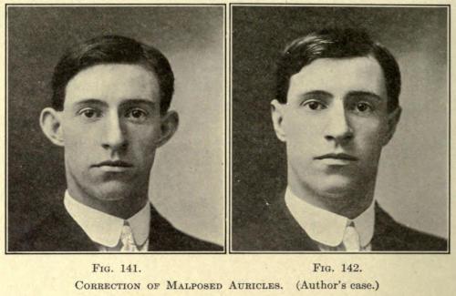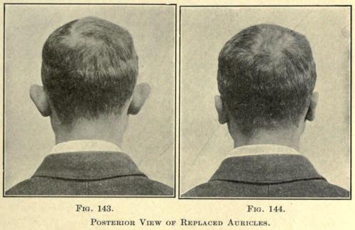 In the illustrations above, Figs. 143 and 144, are shown the posterior view of the ears before and after operation. At no time should the ears be placed too closely to the head, as is often peculiarly requested by the patient, as it gives an unnatural appearance and predisposes toward the collection of filth in the sulcuses that is hard to remove. The distance from the head to the outer rim of the ear should be about half an inch at its widest part.
