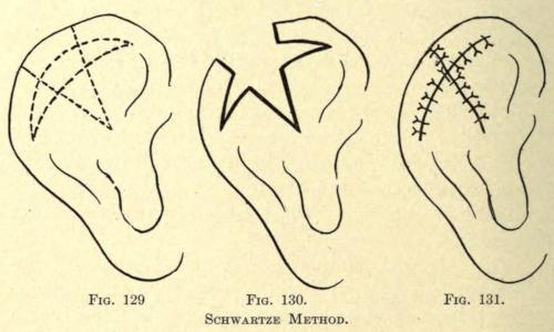 Schwartze Method.—Schwartze advises and has obtained excellent results by removing a long elliptical piece of the entire thickness of the pinna, including both skin and cartilage, from the fossa of the helix, followed by the excision of a triangular section with its base corresponding to the outer border of the helix and its apex terminating well in the concavity of the concha. The scheme of procedure is shown in Figs. 129 and 130. The raw edges are brought together by fine silk sutures, which are made to pass directly through the cartilage, and tied carefully to prevent any change of the transfixed parts, which would mar the result of the operation more or less and necessitate further interference. The arrangement of the sutures and the disposition of the parts are shown in Fig. 131.