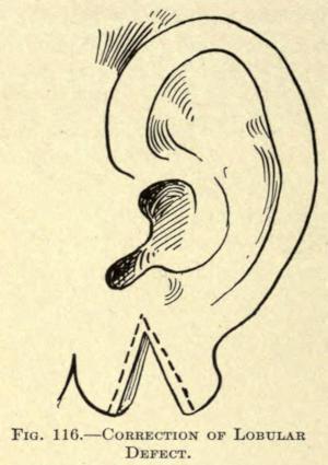The simple exsection of a triangular piece of the lobule and suturing is commonly practiced, with the objection of the notch previously referred to. This operation is very quickly done, and if care be taken in bringing the raw surfaces together neatly a splendid result is attained, especially if the incisions are made obliquely to the plane of the skin.