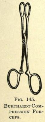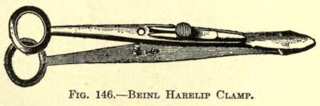 1. By compressing the coronary arteries at both angles of the mouth by digital pressure, suitable clamps or compression forceps. The fenestrated oval forceps, illustrated in Fig. 145, and designed by Burchardt, or the harelip clamp of Beinl, Fig. 146, will be found to meet the purpose well, the latter having a