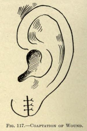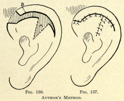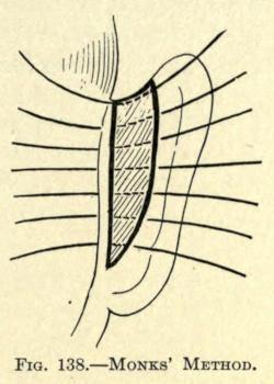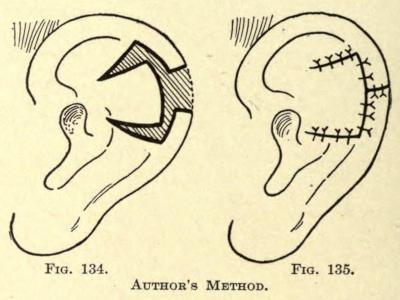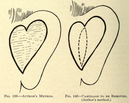moreover, the operation when done early in life necessitates only the removal of an elliptical piece of skin from the back of the ear, according to Monks, and suturing of the wound, as shown in Fig. 138.