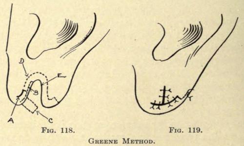 The objection to the above operation is that invariably owing to the resultant contraction a notch is formed at the union of the angles of the freshened wound. To avoid this the operation shown in Fig. 118 is to be employed (Greene).
