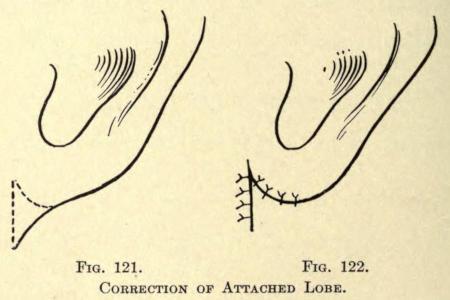 An incision is made in the inferior auricle and in the skin below it, as shown by the dotted lines in Fig. 121, removing the triangular piece of tissue included therein.
