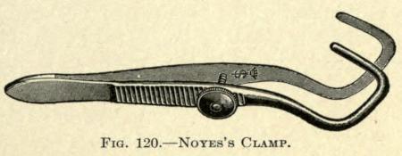 These operations are best performed under local anesthesia, the two-per-cent eucain being preferred. There is practically little bleeding, but even this may be avoided by applying a large Noyes’ compression clamp with its angular arms so placed as to include the entire lobule (Fig. 120).