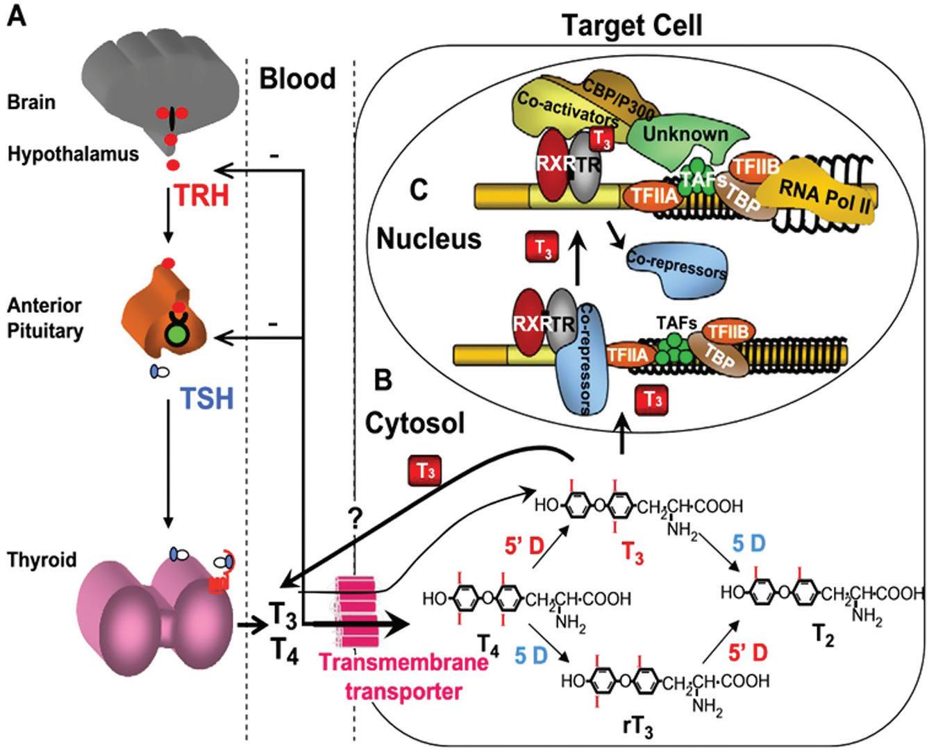 Variations in binding characteristics among normal and abnormal thyroid hormone-binding proteins are responsible for much of the methodologic limitations in assays that attempt to measure concentrations of free T4 and T3 . This large pool of protein-bound hormone provides a stable reservoir that maintains the supply of free, unbound hormone available for transport into the cells. Once within target cells, T4 is further deiodinated to T3 , which in the nucleus binds to the thyroid hormone receptor, modulating the transcription of thyroid hormone-responsive genes and producing most of the clinical effects recognized as the metabolic effects of thyroid hormones.