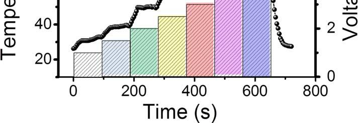 (A)Time-dependenttemperatureprofilesofflexibletran sparentAg-nylonfilmswithdi fferentappliedvoltage.