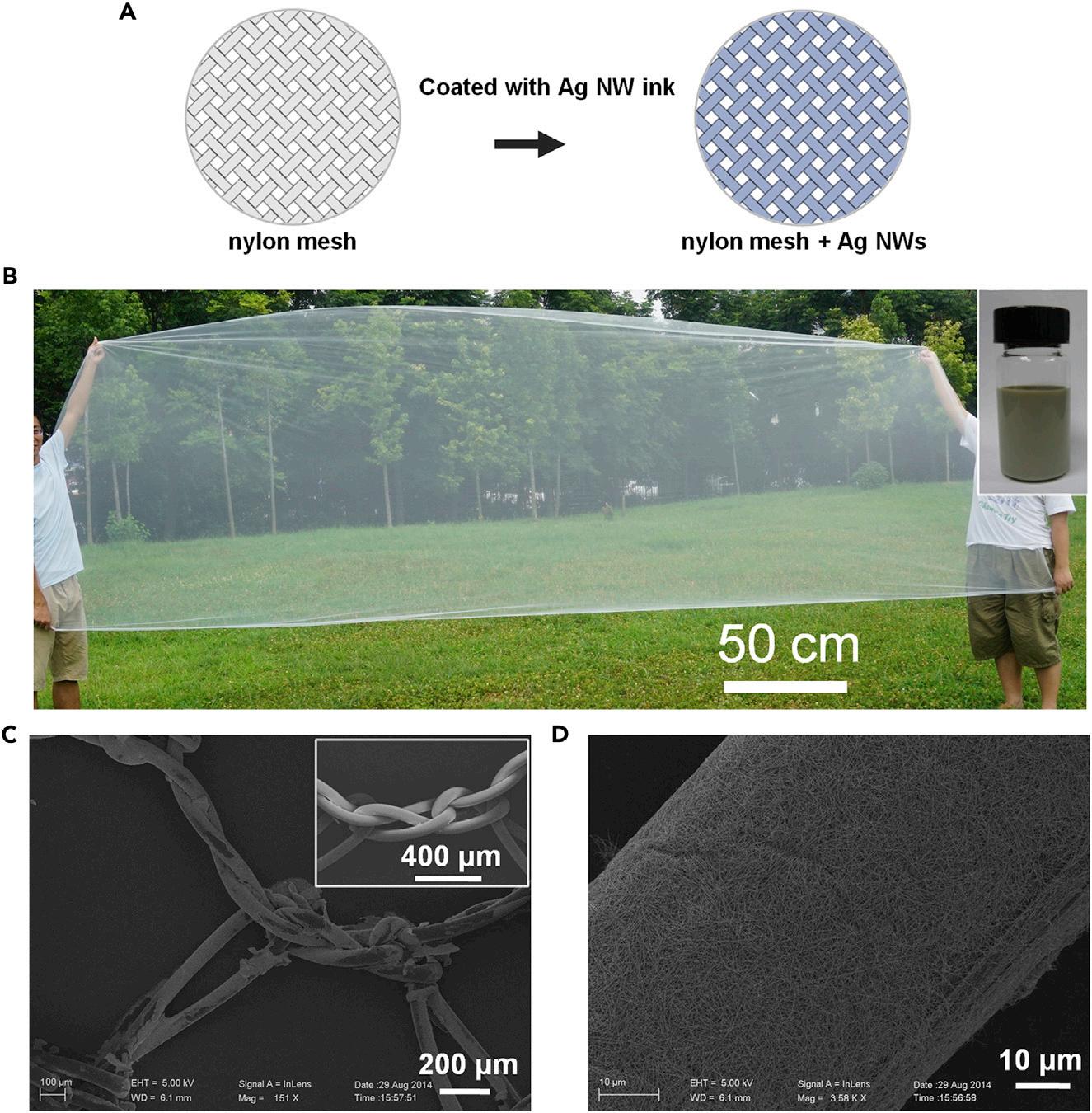 Ourapproachforproducinglarge-areaAg-nylonNWelectrodesisthroughaone-stepcoatingprocessusingcommerciallyavailablenylonclothassubstrateandAgNWethanolsolutionasink,whichisillustratedin Figure1A(VideoS1 in SupplementalInformation).First,high-qualityAgNWswithdiameter60–80nmand length20 m m( FigureS1)weresynthesizedusingthepolyolgrowthprocessreportedpreviouslybyYang etal.withsomemodifications(Yangetal.,2011).Beforethefabricationprocedure,commercialnylon wascleanedwithalcoholandthenacetone,thensubjectedtoultrasonictreatmentfor30min,anddried at60 C.Subsequently,AgNWethanolsolutionwithaconcentrationof3.92mgmL 1 (insetof Figure1B) wasusedasaconductiveinktodyethenylonmeshtoconstructlarge-area(7.5m 2 )conductiveandtransparentelectrodes(Figure1B).AfterfullinfiltrationintheAgNWethanolsolution,thebarenylonmeshwas