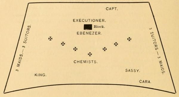 (EnterSUITORS withblock CAPTAIN standsatdoorandtakesticketsfrom maids.EnterEXECUTIONER withgreatpairofscissors—enterCHEMISTS leadingEBENEZER. Alltakepositions,viz.):