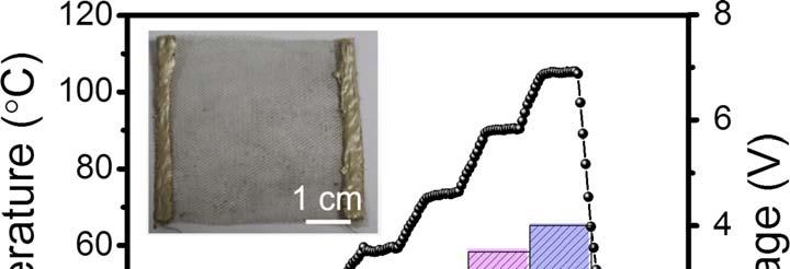 NWs/PEDOT:PSSfilm(6V)(Jietal.,2014).Mostimportantly,theresponsetimefromroomtemperatureto thesteady-statetemperatureofAg-nylonelectrodes(50s)isshorterby83.33%thanthatofgraphene (300s)(Baeetal.,2012),by16.67%thanthatoftheAgNWs(60s)( Kimetal.,2013),andby50%than thatoftheAgNWs/poly(3,4-ethylenedioxythiophene):poly(styrenesulfonate)(PEDOT:PSS)film(100s)(Ji etal.,2014 ).TofurthercontroltheheatingpropertyoftheAg-nylonsubstrate,continuoussquare-wave voltagesareapplied,from1.0V,1.5V,2.0V,2.5V,3.0V,3.5Vto4.0V.Asexpected,thetemperatureexperiencesanorbitofregularechelonrisingasshownin FigureS5.Electricpulses(pulsewidth=60s,+3V) wereapplied,and Figures3Band3Cshowthatthedevicesgivefairlyreproducibleresultsforthehigh-and low-temperatureswitchingphenomena.Afterlong-timeswitchingcycles,thetemperatureoftheelectrode remainsuniforminthewholearea(insetof Figure3B)andisverysensitivetotheinputvoltage(dynamic responsetotemperature),showingnodegradation.In addition,asaversatilestrategy,variousAg-nylon electrodepatterns,suchasacircle,squarering,triangularring,andrectangularring,weredesigned showingauniformheatingperformanceandflexiblewaytomanipulatetheheatingarea(FigureS6).After uniformlycoatingwiththermochromicdye( FigureS7),theflexibleAg-nylonthermochromicfilmshows reversibletransmittanceswitchingwhentheinputvoltageisonandoff(Figure3D).Whenadirectvoltage of5.5Visapplied,ittakes30stochangeitscolorfromblacktowhite(orchangeblanktoblack)(Figure4 E, VideoS2 inSupplementalInformation),whichismuchfasterthanthepreviousreports,suchas