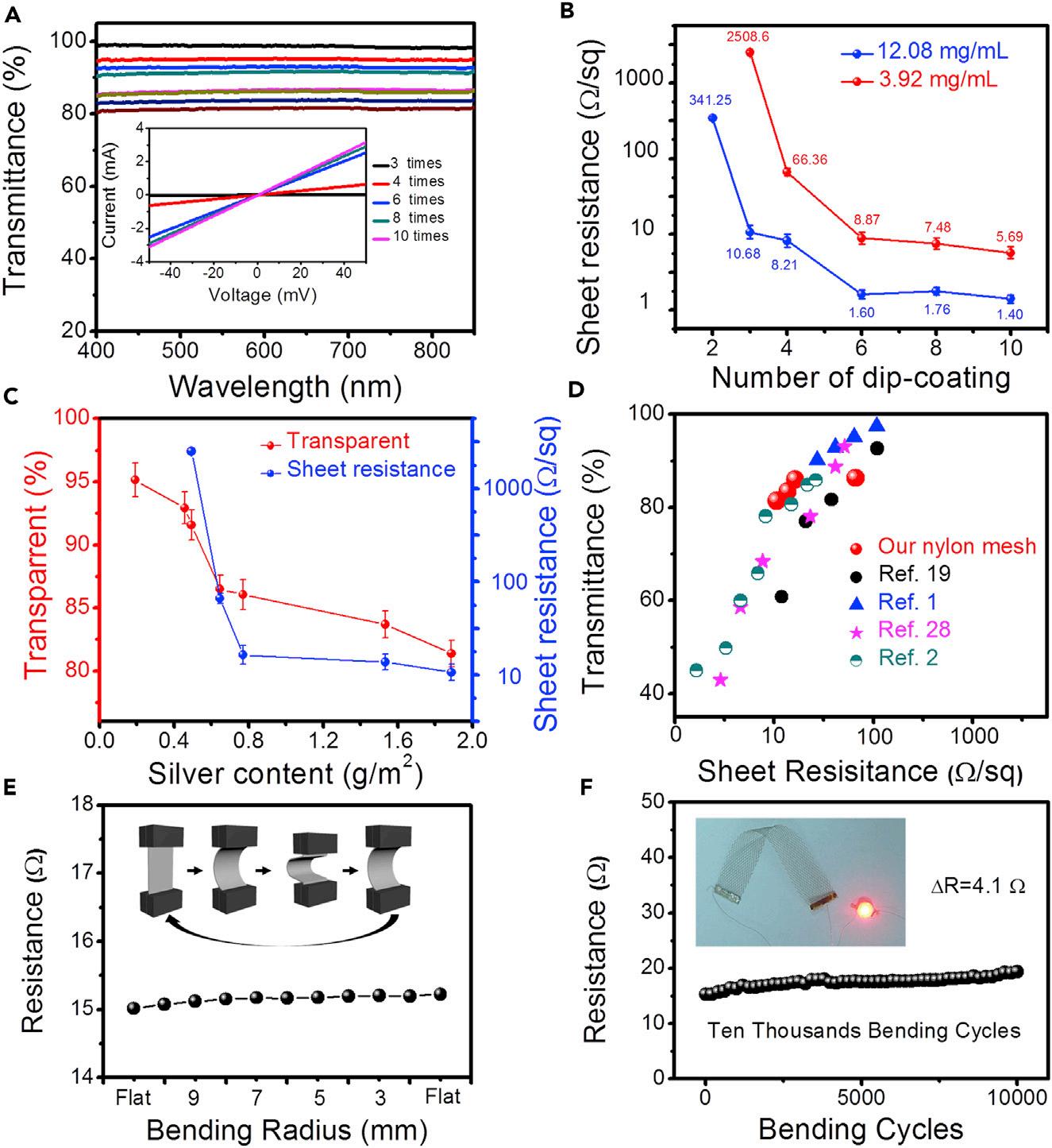 Figure2.OpticalTransmittance,Elec tricalConductivity,andMechanicalPerformanceofAg-NylonElectrodes (A)OpticaltransmittanceoftheAg-nylonelectrodeswithdifferentdippingcycleswithAgNWsolutionconcentrationof 3.92mgmL 1.Fromtoptobottom,thenumbersofdippingcyclesare0,1,2,3,4,6,8,and10.Inset:current-voltage characteristicofconductiveAg-nylonelectrodeswithdifferentdippingcycles.
