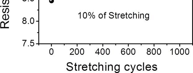 Itiswellknownthatmechanicalflexibilityandstabilityaretwoimportantfactorsforthelonglifeofflexible transparentelectronics.TheobtainedAg-nylontransparentelectrodesexhibitaconstantresistance, whichshowsalmostnodegradationevenafter10,000cyclesoffatiguetestwithaminimumbendingradius of2.0mm,indicatingtheirexcellentmechanicalflexibilityandstability. Figure2Eshowsthattheresistance valuewasconstantduringthecyclicbendingtest,whichwascarriedoutwithahigh-precisionmechanical system(Instron5565A)andaKeithley4200SCSinaclean, metal-shieldedbox.Totestthestabilityofthe Ag-nylonflexibletransparentelectrodes,fatiguetestwascarriedoutin Figure2F,whichshowsgoodconductivitywithelectricalresistanceonlychangingfrom15.2to19.3 U aftermorethan10,000bendingcycles indicatingitsexcellentstabilityandreversibility. Moreover,theAg-nylontransparentelectrodesdepict outstandingstretchableproperties.ItwasfoundthatthestructureandresistanceoftheAg-nylontransparentelectrodesshownodegradationduringthe10%tensiondeformationevenafter1,000stretching cycles( FigureS4),whichisbetterthanthoseoftraditionalITOheaterandgraphene-basedheaters,which canonlyendure1.10%and4.0%tensilestrain,respectively(Kangetal.,2011).
