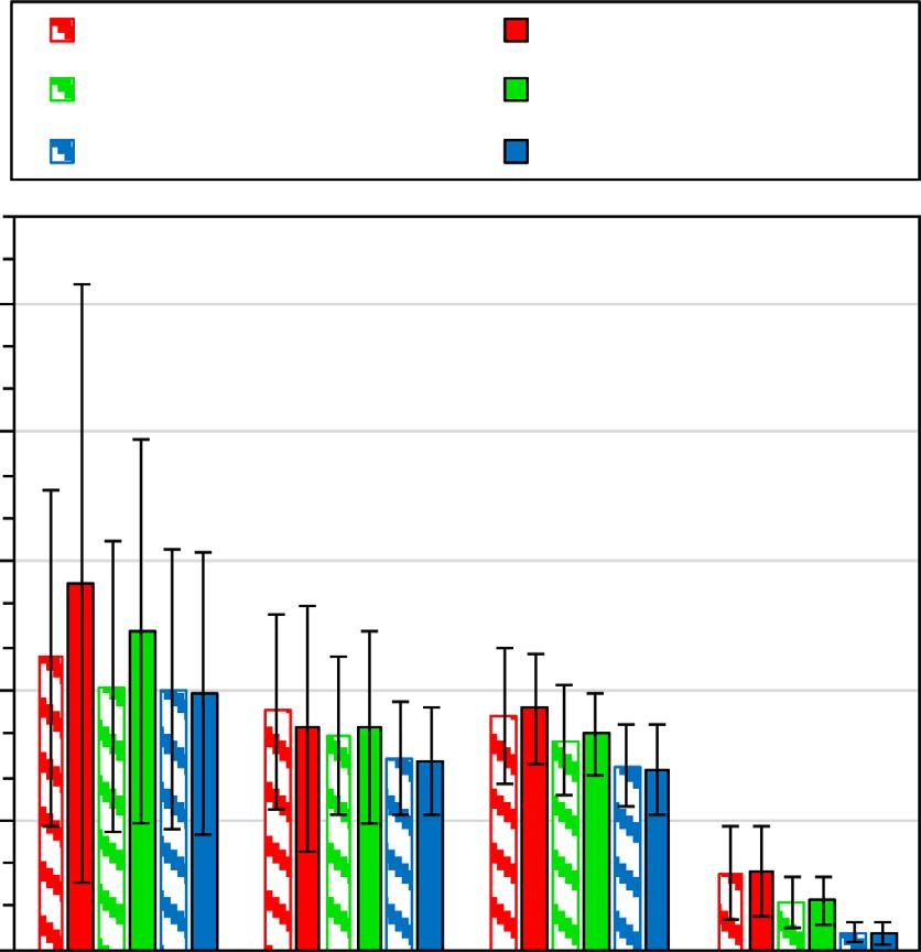 Resultsfromevaluatingthe fifthmetricareshownin Fig.14,where thepercentageofresultingtracksthatcorrespondtotrue fibersforthe +45°/ 60°,±45°,and0°/0°datasetsisplottedonthey-axisusing red,green,andsolidbluebars,respectively.Thepercentageiscalculatedbasedonthenumberofresultingtracksthatcorrespondtoatrue fiber track,independentoftheirlength,dividedbythetotalnumberof true fibertracks.Asseenin Fig.14,3D fiberestimationperformsquite wellatdeterminingthetotalnumberofexisting fiberswithinthesyntheticimagestacksforalldatasetsanalyzed,particularlyforthe0°/0° datasets.Foreachdatasetandindependentofresolution,3D fiberestimationdeterminedapproximately96.8%oftheexisting fibertracks.A majorityofthemissingtracksforoff-axisdatasetswerequiteshort,and wereremovedduringthetrackdeletionstep(see Section2.2.1).In general,theremovaloftracksoccurredatlocationswhere fibercrosssectionswereclippedduringTM,andwheretracksspannedacross10 imagesorless.