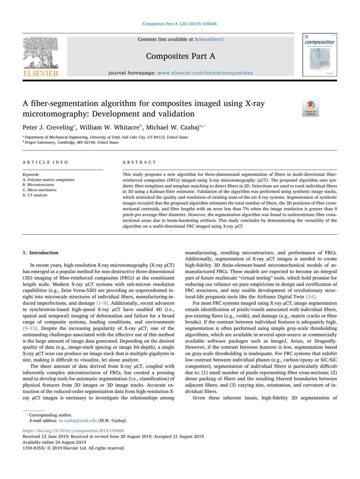whichmadeestimationof fiberdiametersorlocal fiberorientationsnot possible,limitingitsapplicationtounidirectionalcompositeswith constant fiberradii.Thenewalgorithmremovesthislimitationbyusing “synthetic” fiber-templates,whichenablesdetectionof fibercentroids, diameters,andlocal fiberorientationsrelativetothescan-axis.Thenew algorithmalsoincludesproceduresfor fiber-tracksmoothing,track stitching,andoverlapremoval,whichminimizeserrorsassociatedwith theuseoflow-contrastandlow-resolutionX-rayµCTimagedata.The new fiberdetectionandtrackingalgorithmisevaluatedusingsynthetic X-rayµCTimagedatathataredevelopedtomimictheresolutionand qualitythatcanbeobtainedwithexistingstate-of-the-arthigh-resolutionsystems(e.g.,theZeissUltra-810,ZeissVersa-520,orAdvanced LightSourceBeamLine8.3.2).Thebenefitofusingsyntheticimage data,asopposedtorealhigh-resolutiondatafromotherimaging sources(e.g.,see [20]), isthatallinformationabout fiberpositions, shapes,andsizesareknownprecisely,makingvalidationmore straightforward.