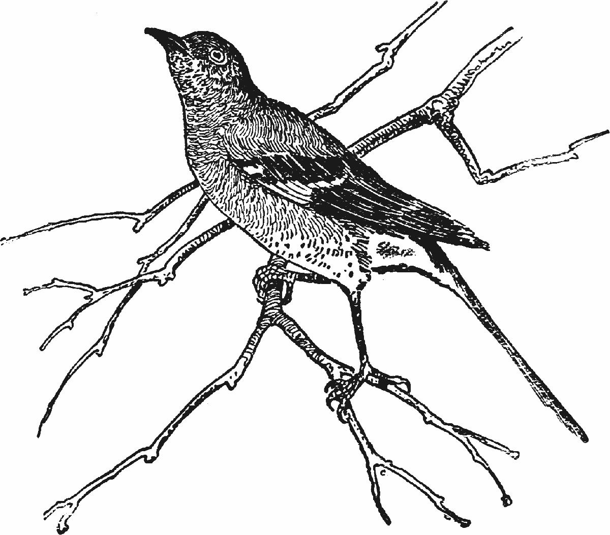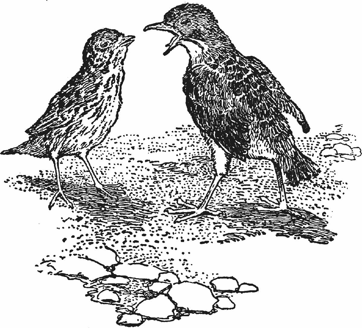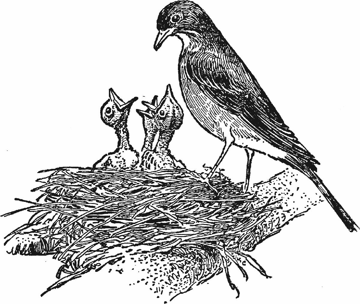 Amusing to relate, the little sparrow took a violent fancy to the robin, and looking upon him as a second parent, followed him all about the cage begging for food. The young robin was dreadfully embarrassed. He could not feed himself—how could he feed another bird? Sometimes when the sparrow’s pursuit grew too hot, he would stop running, and turning, would face the smaller bird with wideopen bill, as if to say, “Look for yourself—there is no food in there.”