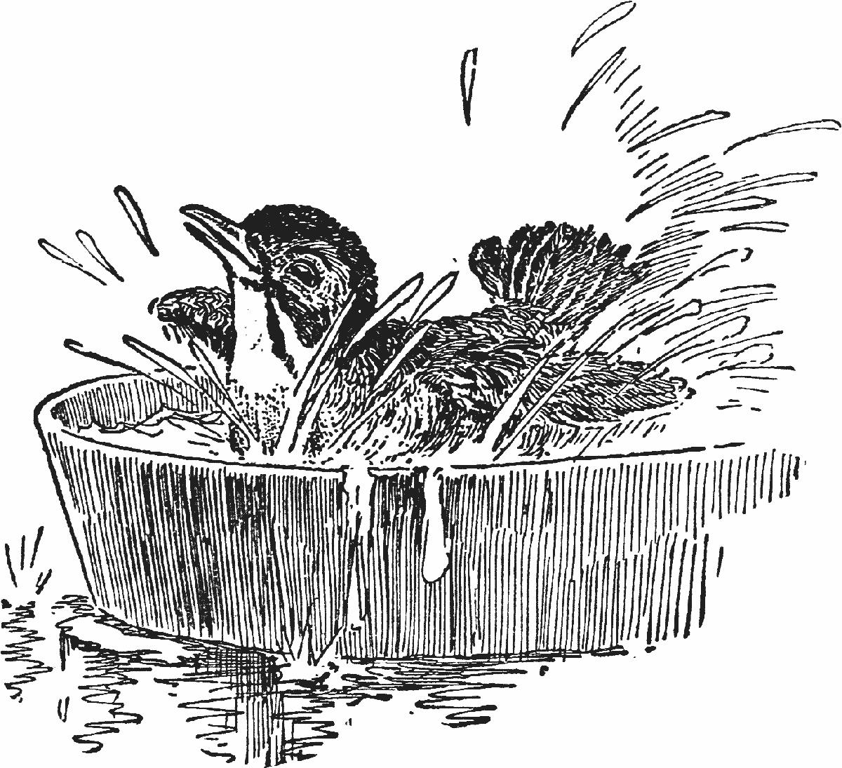 “Hooray!” he chirps in robin joy. “It is fine! I’ll get into it,” and down he goes, and the happy beholder of a robin’s first bath has hard work to suppress a peal of laughter.