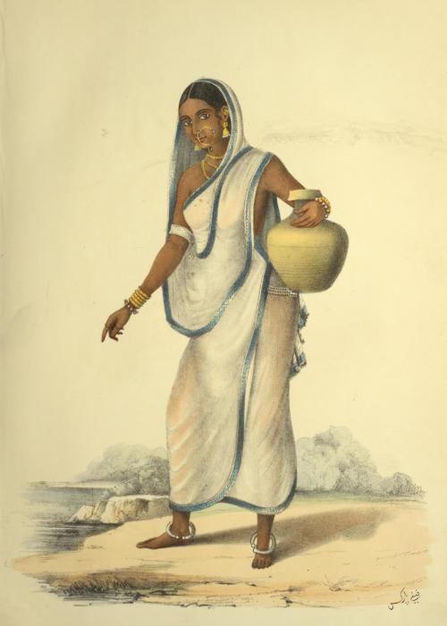 The sketch of “a Bengālī woman” represents the style of attire worn by the ladies of the baboo’s zenāna, with this difference, that the dress of the woman called a sārī is of muslin, edged with a bright blue border; it is passed several times round the figure, but the form of the limbs and the tint of the skin is traced through it: no other attire is worn beneath the sārī; it forms, although in one long piece, a complete dress, and is a remarkably graceful one. Her nosering, ear-rings, and necklaces are of gold; her armlet of silver; the anklets of the same metal. A set of chūrīs (bracelets) adorn her arms, below which is a row of coral, or of cornelian beads. Silver chains are around her waist; her hands and feet are stained with hinnā. She is returning to her home from the river, with her gāgri, a brass vessel filled with water; her attitude may appear peculiar, but it is natural; by throwing out one hip, a woman can carry a heavy water-jar with ease. A child is often carried astride the hip in the same manner; hence the proverb, speaking of a vicious child, says, “Perched on your hip, he will peck your eyes out.” The dark line of surma is distinctly seen around her eyes, and a black dot between the eyebrows.