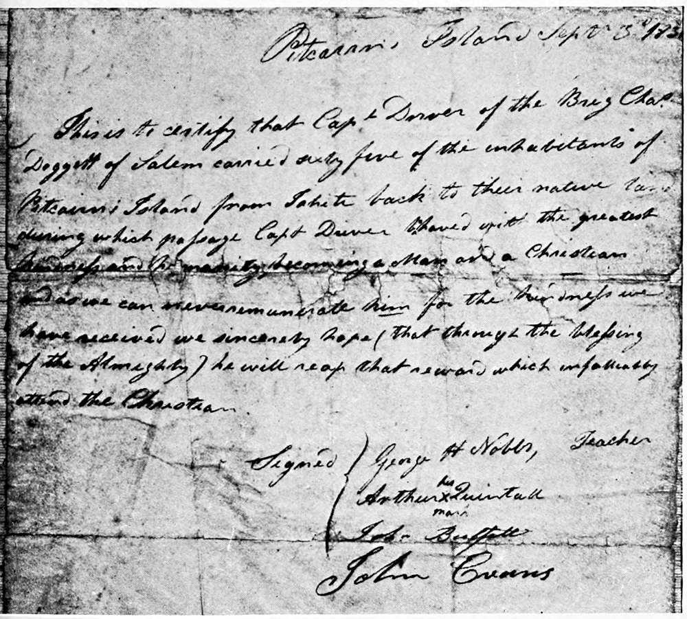 This is to certify that Captain Driver of the Brig Chas. Doggett of Salem carried sixty-five of the inhabitants of Pitcairn Island from Tahiti back to their native land during which passage Capt. Driver behaved with the greatest kindness and humanity becoming a man and a Christian, and as we can never remunerate him for the kindness we have received, we sincerely hope that through the blessing of the Almighty he will reap that reward which infallibly attends the Christian.”