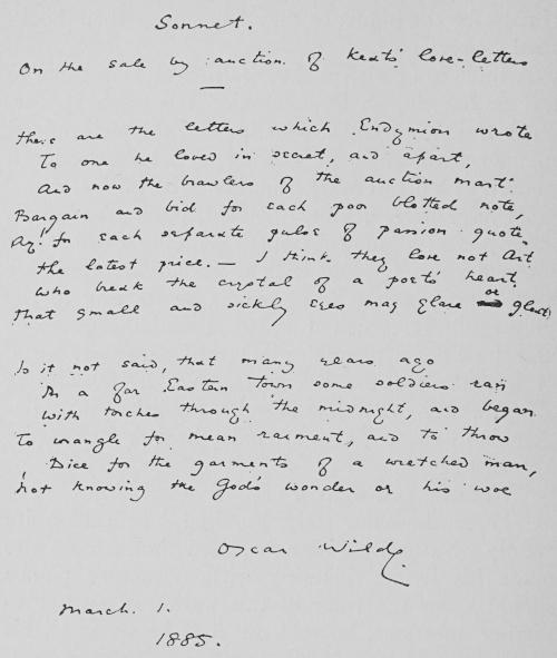 ORIGINAL MANUSCRIPT OF OSCAR WILDE’S SONNET, “ON THE SALE BY AUCTION OF KEATS’ LOVE-LETTERS”