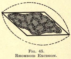 In excisions in small rhomboidal form, the skin is merely dissected up and around the wound, the same as in Fig. 45, and the wound is sutured in linear form, as shown in Fig. 46.