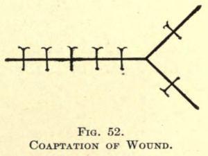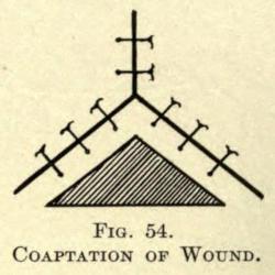 Likewise can a triangular fault be brought together by sewing in the greater angles and making a linear wound of the remaining part, as in Figs. 51 and 52.