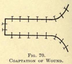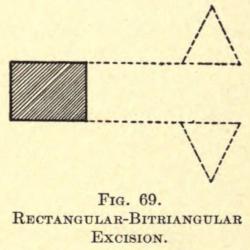 Through the sacrifice of two triangles a large oblong or square defect may be covered, the excisions being shown in Fig. 69 and the suturing in Fig. 70.