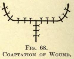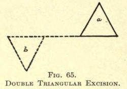 Where the triangular defect has a wide base, bilateral triangular sections of skin are removed (Fig. 67), and the flaps are coapted, as in Fig. 68.