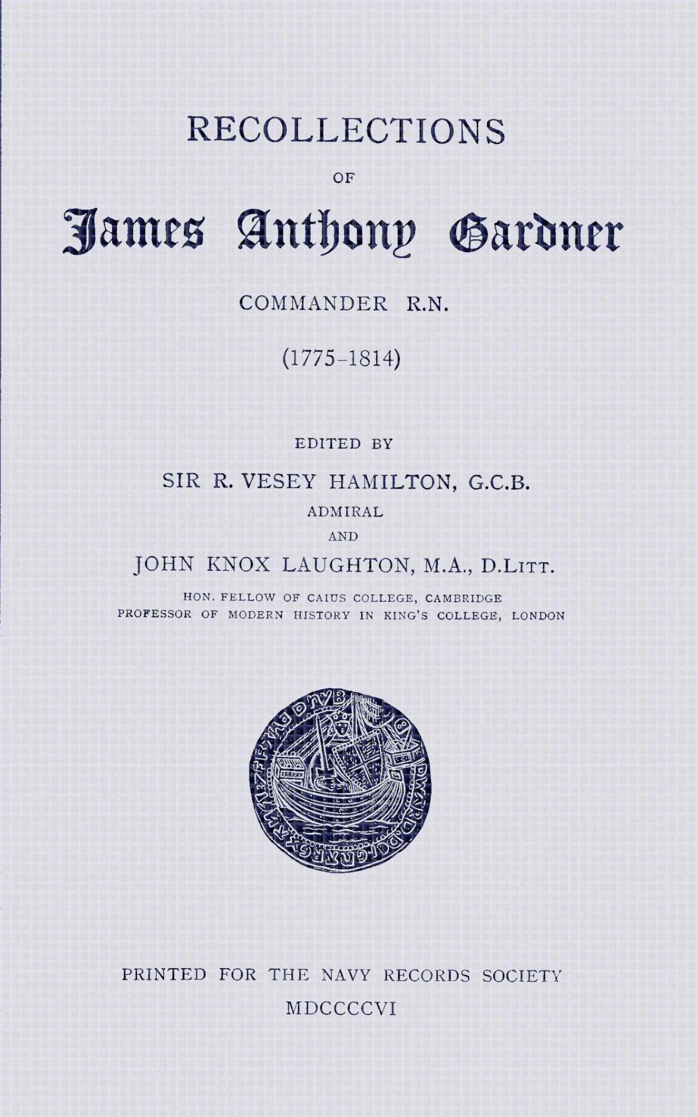 The ‘Recollections’ which by the kindness of the authors grandsons, Francis William and Henry James Gardner, we are now permitted to print, were written in 1836, and corrected, to some small extent, in later years. We have no information of the sources from which he composed them. He must have had his logs; and we may suppose either that these took the form of journals, or that he had also kept a journal with some regularity. Certainly it is not probable that, without some register, he could have given the lists of his shipmates, correct even—in very many cases—to the Christian