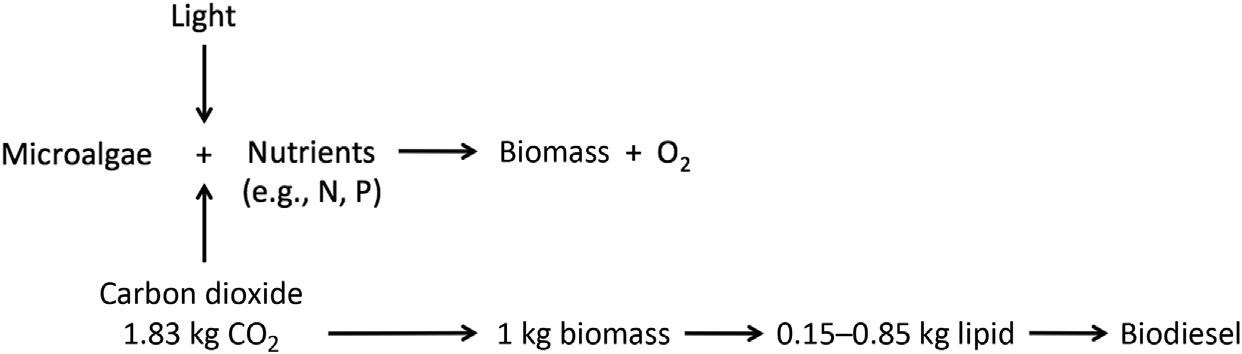 Thatis,foreverygram(dryweight)ofmicroalgae,1.83gofCO2 is takenup.Theconceptofcarboncaptureusingmicroalgaeandsubsequent biofuel(biodiesel)productionisshownin Fig.1.1.