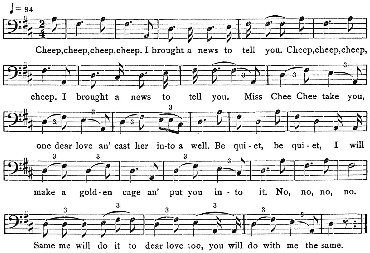 And at de said time, de young girl had a sweetheart outside name of William. An’ William mamma heard de song ’pon de ribber-side and send away to carpenter-shop an’ tell William heard his girl singing quite mournful on ribber-side. An’ him go up on lime-tree an’ pick four lime an’ gwine a fowlnest an’ tek four fowl-egg an’ gwine a turkey-nest an’ tek four turkey-egg an’ tek four marble, an’ call de girl an’ put her before him. An’ William an’ de girl mudder-in-law come to a battle at de ribber-side an’ William kill de woman. An’ he put de girl before him an’ carry her home an’ marry her