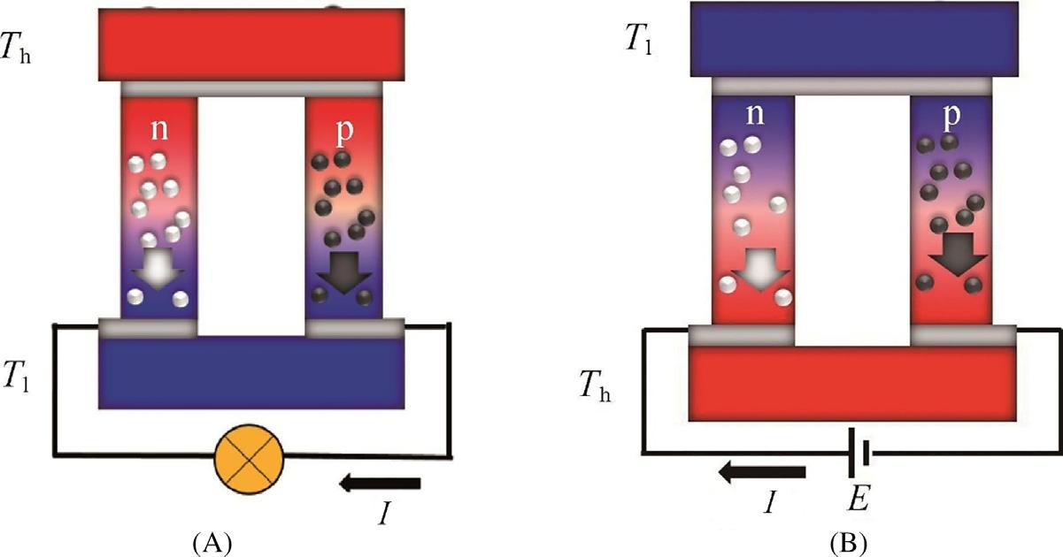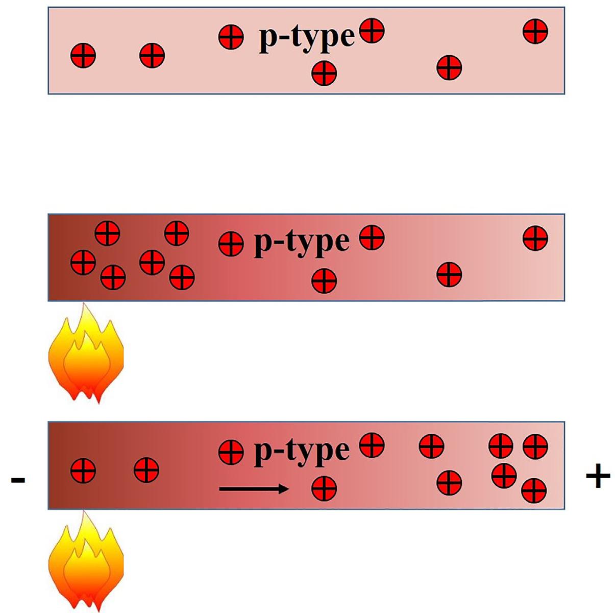 Thegenerationofthermoelctricpotentialcanbesimplybutprincipally explainedbythefluctuationofchargedistributionunderatemperature gradient.Asshownin Fig.1.2,takingthe p-typesemiconductor(holesare majoritycarriers)asanexample,whenthetemperaturefieldisuniform, thedistributionofcarriers(concentration,energy,andvelocity)isalso uniformandthematerialasawholeiselectricallyneutral.Whenthereis atemperaturedifferencebetweenthetwoendsofmaterial,theholecarriersatthehotend(thetemperatureis T 1 ΔT)gainhigherenergy (E 1 ΔE)thanthecoldend(thetemperatureis T),andthusbecomemore pronetodiffusetowardthecoldend.Drivenbythetemperature/energy difference,moreholesdiffusetoandaccumulateatthecoldend,andthe distributionofchargesbecomesnonuniformanymore,forminganinner electricfield.Theinnerelectricfieldyieldsareverseddriftchargecurrent.Whenadynamicequilibriumisestablishedbetweenthethermal activateddiffuseandinnerfielddrivendriftchargeflows,asteadyvoltage V isformed.