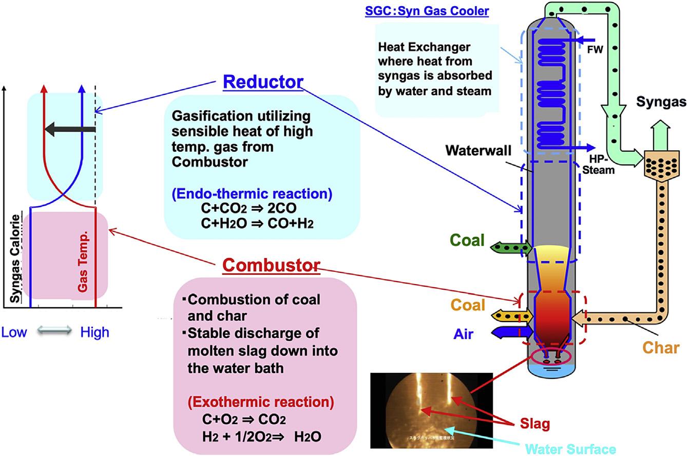 Becausecoalconversioninagasifierislimited,atcertainlevels,toone passthroughthereactor,syngasatthegasifieroutletcontainsunreacted carbonparticles,so-calledchar.Capturingofcharanditsrecirculationto thegasifierisaroutineprocedureofamoderngasifierthatexhibitshigher conversionofcoal.Thetypicalcharrecycleprocedureisillustratedin Fig.1.1 togetherwiththebasiccoalgasificationmechanismsinreactors. Syngasisproducedbythegasificationreactionsthatconvertmajorcomponentsofcoal:carbon,hydrogen,andoxygen.Theultimateconversionof coaltosyngascalculatedbycarbonbaseexceeds99%whenthecharrecycle strategyisapplied.Thehighconversionofcoalensuressufficientcalori fic