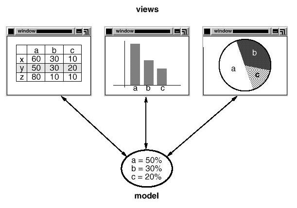 spreadsheet, histogram, and pie chart display these data in various ways. The modelcommunicateswith itsviewswhenitsvalueschange,andtheviews communicate with the model to access these values.