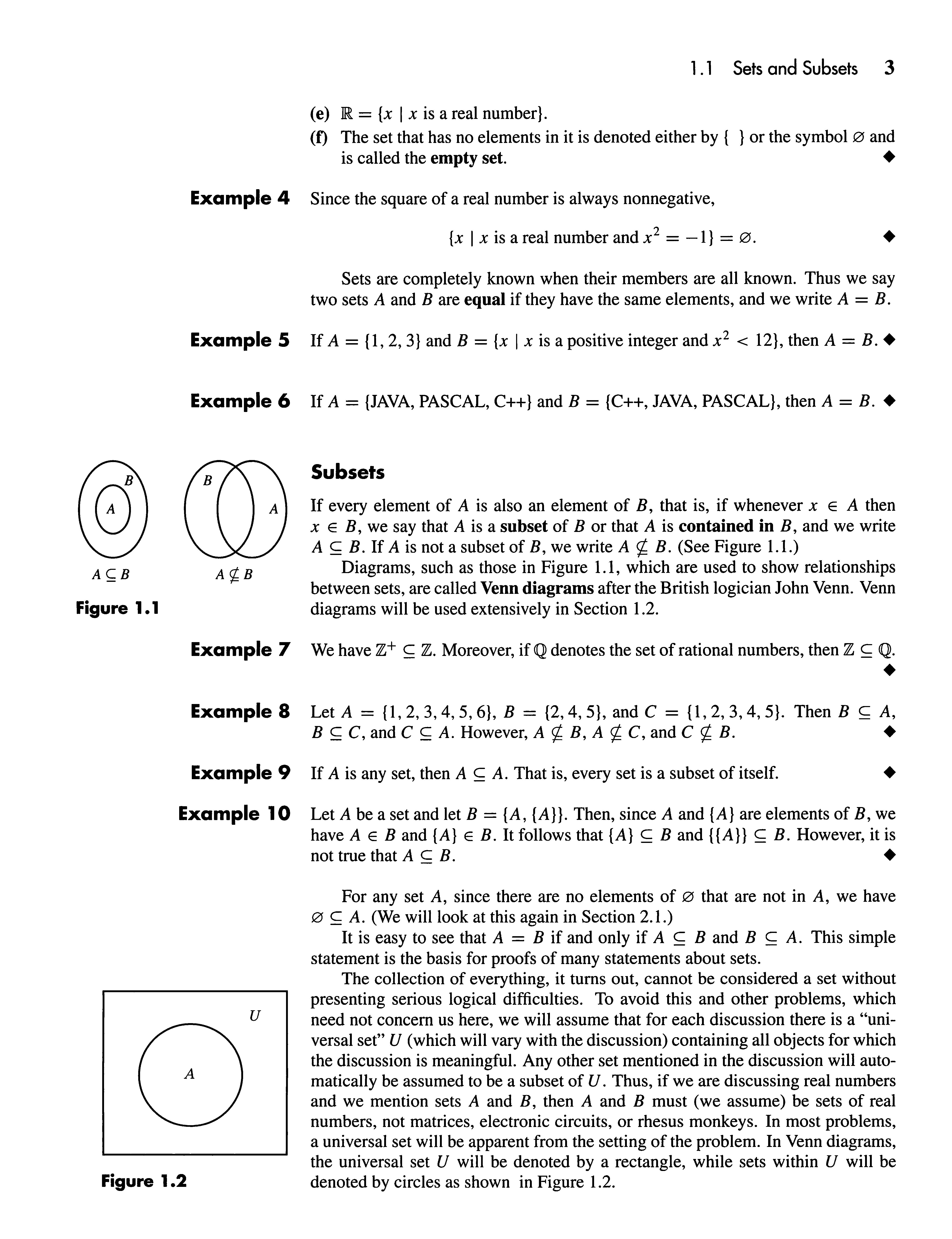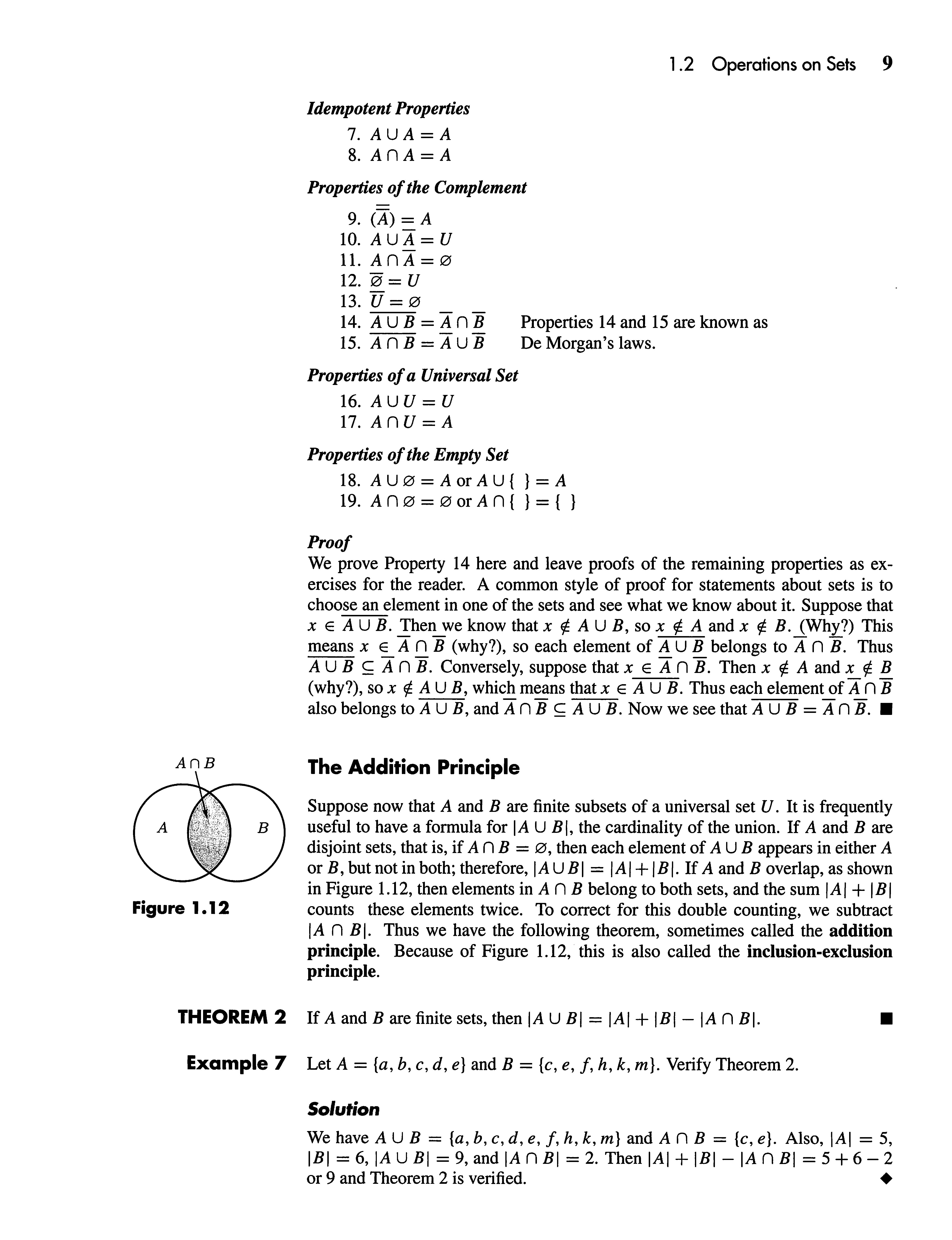 The operations onsetsthatwehavejust defined satisfymany algebraic properties, someofwhichresemblethealgebraicpropertiessatisfiedbytherealnumbersand their operations. Allthe principal properties listedherecanbeprovedusingthe definitions given andthe rules of logic. We shallproveonlyoneofthe properties andleaveproofsofthe remaining onesas exercises forthereader. Proofs are fundamental to mathematics. WediscussprooftechniquesinChapter2,butinthis chaptersomeproofsare given as examples forlaterwork.Somesimpleproofsare required inthe exercises. Venn diagrams areoftenusefultosuggestorjustifythe method of proof.