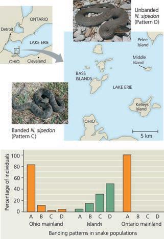 Figure 23.12 Gene flow and local adaptation in the Lake Erie water snake (Nerodia sipedon).