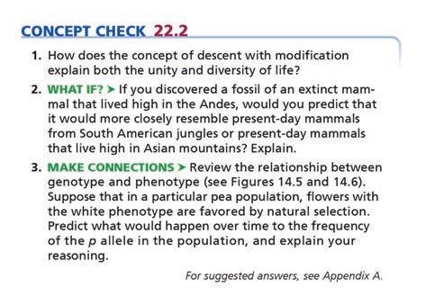 A major goal for this revision was to strengthen how we help students understand and interpret visual representations of evolutionary data and concepts. Toward this end, we have added a new figure (Figure 25.8), “Visualizing the Scale of Geologic Time,” and a new figure (Figure 23.12) on gene flow. Several figures have been revised to improve the presentation of data, including Figure 24.6 (on reproductive isolation in mosquitofish), Figure 24.10 (on allopolyploid speciation), and Figure 25.25 (on the origin of the insect body plan). The unit also features new material that connects evolutionary concepts and societal problems. Examples include text in Chapter 22 on the 2015 discovery of teixobactin, an antibiotic that is effective against some hard-to-treat pathogens, a new discussion in Chapter 24 on the impact of climate change on hybrid zones, and a new Problem-Solving Exercise in Chapter 24 on how hybridization may have led to the spread of insecticide resistance genes in mosquitoes that transmit malaria. The unit also includes new chapteropening stories in Chapter 22 (on a moth whose features illustrate the concepts of unity, diversity, and adaptation) and Chapter 25 (on the discovery of whale bones in the Sahara Desert). Additional changes include new text in Concept 22.3 emphasizing how populations can evolve over short periods of time, a new table (Table 23.1) highlighting the five conditions required for a population to be in Hardy-Weinberg equilibrium, and new material in Concept 25.1 describing how researchers recently succeeded for the first time in constructing a “protocell” in which replication of a template strand of RNA could occur.