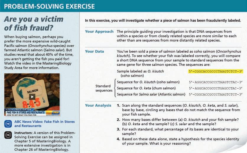New Visualizing Figure 5.16 helps students understand various ways proteins are depicted. A new ProblemSolving Exercise engages students by having them compare DNA sequences in a case of possible fish fraud.
