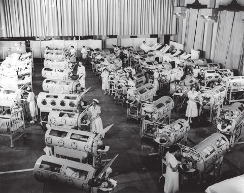 FIG. 1-1 Patients in iron lungs receive treatment at Rancho Los Amigos during the polio epidemic of the 1940s and 1950s. (Courtesy Rancho Los Amigos.)
