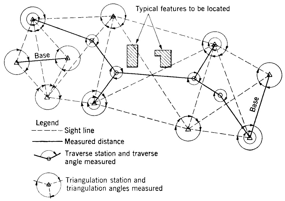 FIGURE 1-13. A horizontal control survey network showing traverse and triangulation stations (points) and courses (lines).
