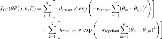 In Eq. (1.7), JCC(θ, P(j, k, l)) represents the effects of a raction and repulsion in a combined manner. The term θi, m is the element m of the vector position of a bacterium i, and the term θm refers to a point in the optimization domain. The repellant and a ractant phenomena are modeled using the constant terms da ract, wa ract, hrepellant, and wrepellant (Passino, 2002).