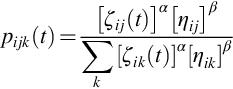 Eq. (1.2) (Dorigo et al., 1996) shows the probability (pijk(t)) of moving from a point i to j at time t for the ant k. This is the expression for valid transitions, which are included using a tabu list. The parameters α and β are used to represent the importance of the pheromone trail and route visibility (ηij).