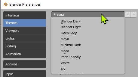 In the Preferences Editor, select Themes in the left hand column and click on Presets to display the list of color schemes.