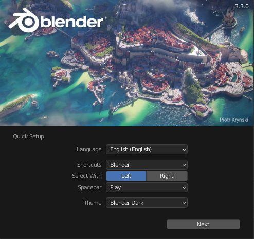 The very first time Blender runs the Graphical User Interface displays on the computer Screen with a default Theme or color scheme named Blender Dark. You will see this as one of the Quick Setup options in the Splash Screen