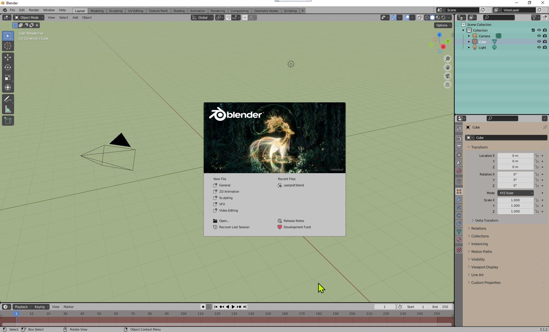There are four Editors displayed when Blender is first opened. The Editors are; the 3D Viewport Editor, the Outliner Editor, the Properties Editor and the Timeline Editor. In the center of the display you see the Splash Screen showing you which version of Blender you have opened and containing buttons for selecting a variety of functions.