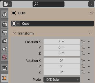 With the Cube Object selected in the 3D Viewport Editor, altering the X Location Slider value to 3m and the Z Axis Rotation Slider to 19.8° moves the Cube forward along the X Axis (Red Line) and rotates the Cube about the vertical Z Axis.